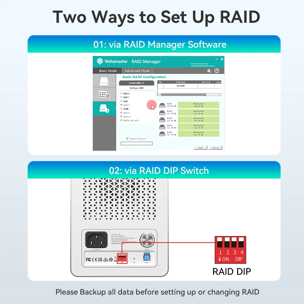 - RAID Configurations: Choose between JBOD, RAID 0, and RAID 1 settings to optimize your data storage based on your needs.