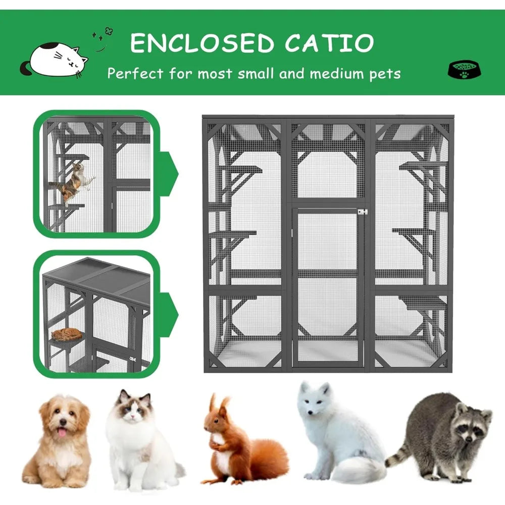 Outdoor Wooden Cat House Catio Large Cat Enclosure with 6 Platforms Waterproof Roof Secure Mesh Walls and Locking Door Feral Cat Shelter