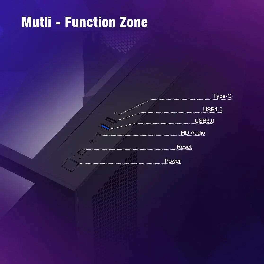 - Front Ports: USB 3.0 (1), USB 1.0 (1), Type-C, and HD Audio for easy access